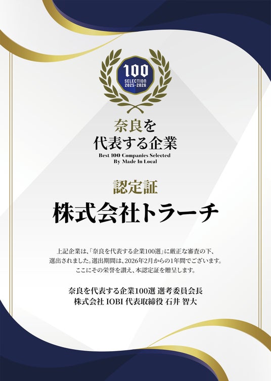 株式会社トラーチは、2026年1月6日、地方創生メディア「Made In Local」が選出する「奈良を代表する企業100選」に選出されました。本取り組みは、地域社会への貢献や若手育成、独自性のある事業モデルなどを基準に、奈良県内の企業を厳選して紹介するものです。トラーチは、「住まいと家計を守る」という理念のもと、太陽光発電・蓄電池事業を中心に、地域に根ざした誠実な事業運営を続けてきました。また、若手人材の育成や再現性のある営業体制づくりにも力を入れ、未経験からでも成長できる環境を整えています。こうした姿勢が、地域や第三者から評価されたことは、トラーチが学生本人だけでなく、その家族にとっても安心して選べる企業であることの一つの証だと考えています。