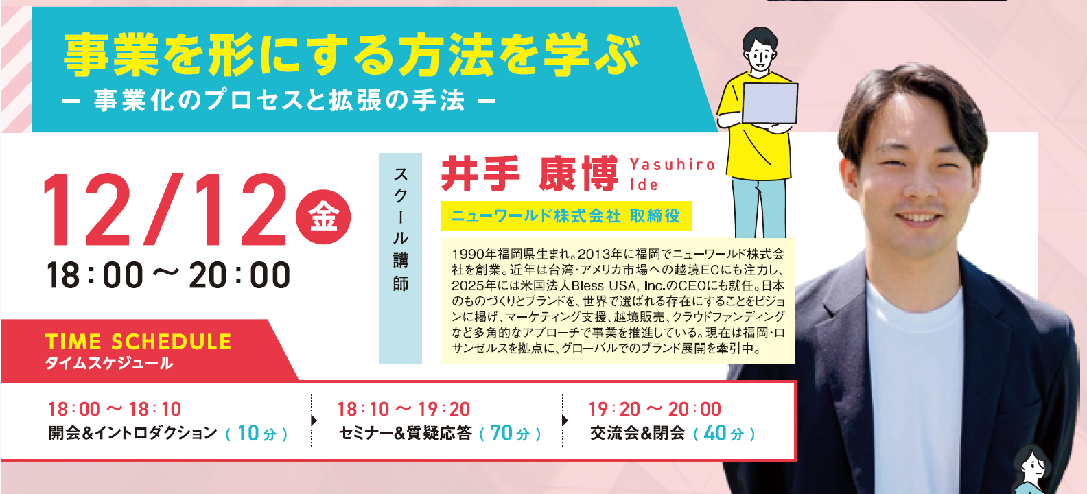 2.「事業を形にする方法を学ぶ―事業化のプロセスと拡張の手法―」■日時:2025年12月12日(金)18時~20時