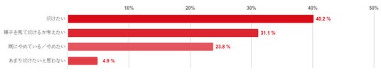「続けたい」と回答した人が40.2%と約4割で最も多く、「様子を見て続けるか考えたい」が31.1%だった。また、「既にやめている/やめたい」や「あまり続けたいと思わない」と回答した人は少数意見となり、治療の継続を前向きに考えている人が多い結果となった。