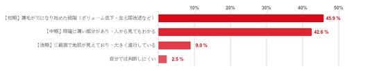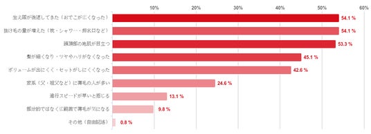 「生え際が後退してきた(おでこが広くなった)」、「抜け毛の量が増えた(枕・シャワー・排水口など)」との回答が共に54.1%と最も多く、僅差で「頭頂部の地肌が目立つ」との回答が53.3%となった。そのほか、「髪が細くなり、ツヤやハリがなくなった」(45.1%)や「ボリュームが出にくく、セットがしにくくなった」(42.6%)を選んだ人も多くみられた。