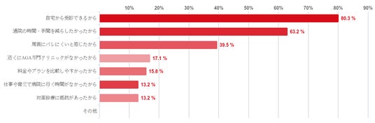 「自宅から受診できるから」との回答が80.3%で最も多く、次いで「通院の時間・手間を減らしたかったから」が63.2%となり、この二つの回答が圧倒的に多く、利便性を理由にオンライン診療を利用している人が多いことが分かった。また、三番目に多かった「周囲にバレにくいと感じたから」は39.5%だった。