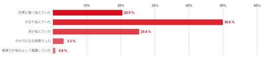 「かなり悩んでいた」と回答した人が50.0%で最も多く、続いて「多少悩んでいた」が25.4%、「非常に強く悩んでいた」が20.5%という順となり、悩みの程度が大きかった人が多いことがわかった。