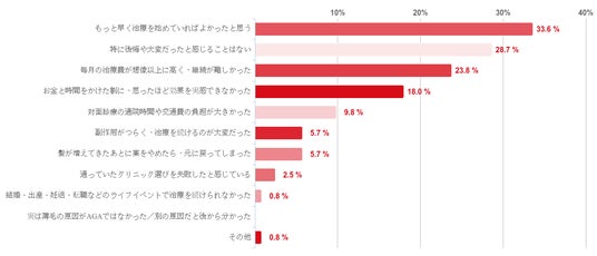 「もっと早く治療を始めていればよかったと思う」との回答が過半数の33.6%で最も多く、「特に後悔や大変だったと感じることはない」が28.7%で二番目に多く、治療に肯定的な意見が上位となった。また、「毎月の治療費が想像以上に高く、継続が難しかった」との回答が23.8%、「お金と時間をかけた割に、思ったほど効果を実感できなかった」との回答が18.0%となった。