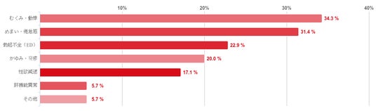 「むくみ・動悸」を選んだ人が34.3%と最も多く、次に「めまい・倦怠感」が31.4%で続いた。「勃起不全(ED)」や「かゆみ・発疹」などの回答も一定数みられた。