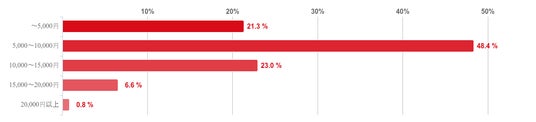 「5,000~10,000円」と回答した人が48.4%と約半数で最も多かった。次いで「10,000~15,000円」と回答した人が23.0%、「~5,000円」(5,000円以内)と回答した人が21.3%で続いた。なお、「15,000~20,000円」、「20,000円以上」と回答した人は僅かとなった。