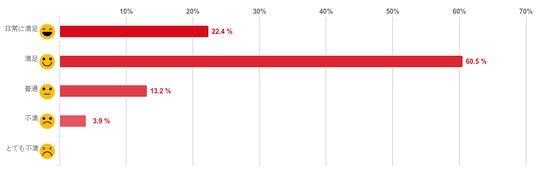 「満足」と回答した人が60.5%と6割を超えて最も多く、次いで「非常に満足」との回答が22.4%で次に多くみられた。反対に、「不満」と回答した人は3.9%と僅かで、「とても不満」と回答した人はひとりもおらず、回答者の8割以上が、利用したオンライン診療に満足していることがわかった。