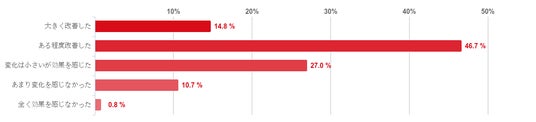 「ある程度改善した」と回答した人が46.7%で半数近くとなり、次に「変化は小さいが効果を感じた」との回答が27.0%となった。また、「全く効果を感じなかった」や「あまり変化を感じなかった」と回答した人は僅かで、回答者のほとんどが治療の効果を実感していることがわかった。