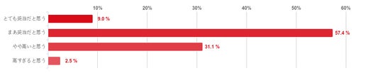 「まあ妥当だと思う」が57.4%で最も多く、「やや高いと思う」が31.1%だった。また、「高すぎると思う」と回答した人は2.5%となり、費用が高すぎると思っている人はほとんどいないことがわかった。