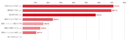 「効果が出るか不安だった」を選んだ人が71.3%と最も多く、次いで「費用面が不安だった」が69.7%、「副作用が怖かった」が57.4%と続いた。反対に「特に不安はなかった」を選んだ人はひとりもいなかった。