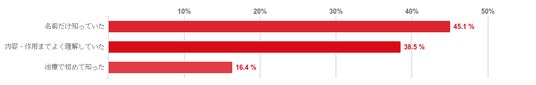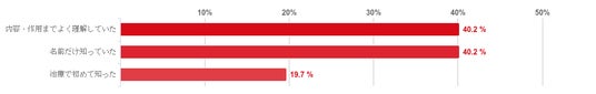 「フィナステリド」(34.4%)「デュタステリド」(48.4%)については「治療で初めて知った」という人が多くみられ、「ミノキシジル内服薬」(45.1%)「ミノキシジル外用薬」(40.2%)については「内容・作用までよく理解していた」という人が多くみられた。