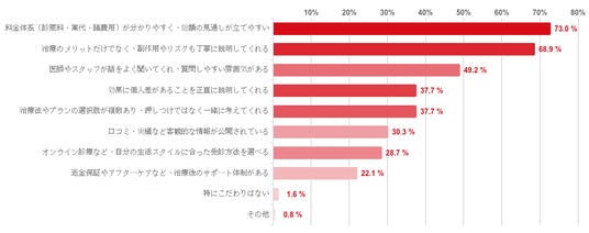 「料金体系(診察料・薬代・諸費用)が分かりやすく、総額の見通しが立てやすい」との回答が73.0%で最も多く、次いで「治療のメリットだけでなく、副作用やリスクも丁寧に説明してくれる」との回答が68.9%、「医師やスタッフが話をよく聞いてくれ、質問しやすい雰囲気がある」との回答が49.2%と続いた。また、「効果に個人差があることを正直に説明してくれる」と「治療法やプランの選択肢が複数あり、押しつけではなく一緒に考えてくれる」との回答も37.7%と約4割となった。