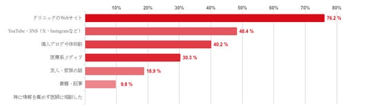 「クリニックのWebサイト」が76.2%で圧倒的に多かった。次いで、「YouTube・SNS(X、Instagramなど)」(48.4%)、「個人ブログや体験談」(40.2%)、「医療系メディア」(30.3%)と続いた。また、「特に情報を集めずに医師に相談した」と回答した人はおらず、回答者の全員が、何らかの情報を得てからAGA治療を始めていることがわかった。