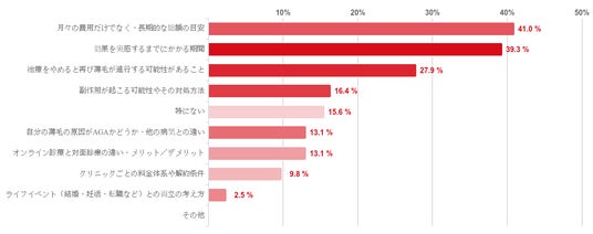 「月々の費用だけでなく、長期的な総額の目安」との回答が41.0%で最も多く、次いで「効果を実感するまでにかかる期間」との回答が39.3%、「治療をやめると再び薄毛が進行する可能性があること」との回答が27.9%と続いた。また、「特にない」との回答が15.6%集まった。
