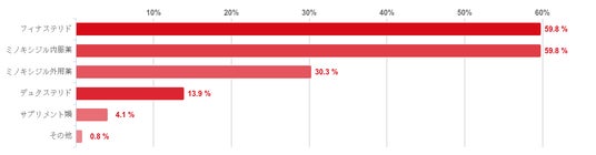 「フィナステリド」と「ミノキシジル内服薬」が共に59.8%と圧倒的に多かった。そのほか、「ミノキシジル外用薬」(30.3%)や「デュタステリド」(13.9%)などの回答も一定数みられた。