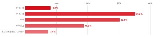 「3~4ヶ月」と回答した人が最も多く35.2%、続いて「半年」と回答した人が30.3%で二番目に多かった。また、「まだ効果を感じていない」との回答は7.4%と僅かだった。