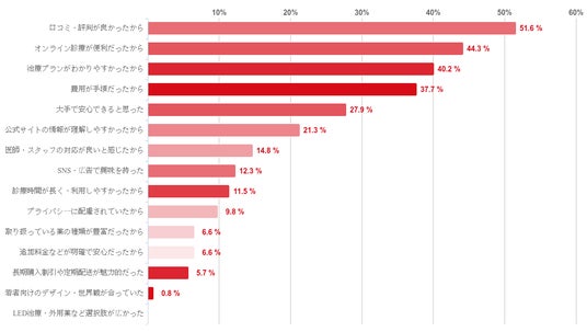 「口コミ・評判が良かったから」と回答した人が51.6%で最も多く、続いて「オンライン診療が便利だったから」が44.3%「治療プランがわかりやすかったから」が40.2%、「費用が手頃だったから」が37.7%という順となった。また、「大手で安心できると思った」や「公式サイトの情報が理解しやすかったから」などの回答も一定数みられた。