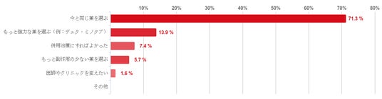 「今と同じ薬を選ぶ」と回答した人が71.3%と圧倒的に多く、処方された治療薬に満足している人が多い傾向がうかがえた。次いで「もっと強力な薬を選ぶ(例:デュタ・ミノタブ)」が13.9%、「併用治療にすればよかった」が7.4%と少数で続いた。