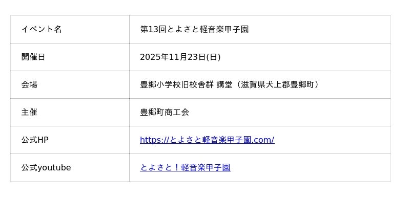 豊郷町商工会(住所:滋賀県犬上郡豊郷町大字石畑374-6 会長:北川 泰史)は、2025年11月23日に開催された「第13回とよさと軽音楽甲子園」決勝大会の公式ライブ映像を、2026年2月27日(金)17時より公式YouTubeチャンネルにて公開いたしました。本大会は、全国から過去最多となる97組のエントリーが寄せられ、その中から厳正な審査を通過した10組が、歴史的建造物である豊郷小学校旧校舎群(住所: 滋賀県犬上郡豊郷町石畑518)のステージに立ちました。文部科学大臣賞をはじめとする各賞に輝いた、次世代を担う若き才能たちの圧巻のパフォーマンスを、高画質なデジタルアーカイブとしてお届けします。