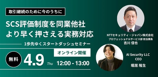 AIセキュリティ株式会社(本社:東京都新宿区、代表:堀居 隆生、以下「AI Security」)は、NTTセキュリティ・ジャパン株式会社と共同で、2026年4月9日(木)にオンラインセミナー『取引継続のために今のうちに:SCS評価制度を同業他社より早く押さえる実務対応 ~1歩先ゆくスタートダッシュセミナー~』を開催いたします。