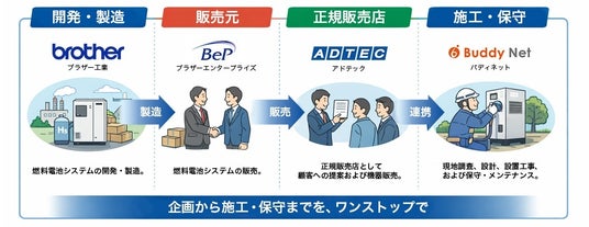 こうした課題に対し、ブラザーの「純水素燃料電池」が有する「水素吸蔵合金」技術は、都市部でも安全かつクリーンな電力供給を可能にします。本システムこそが次世代の社会インフラに求められる理想的な解決策であると考え、産業用ソリューションのアドテックが販売を、社会インフラ構築を担うバディネットが施工を行うことで、スムーズな導入を可能にする供給体制を整えました。