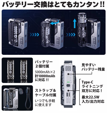 バッテリー2個付属で、合計最大10,000mAhの容量に対応しています。