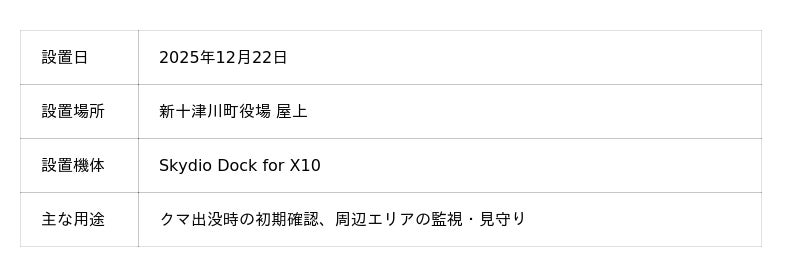 近年、北海道においては市街地へのクマ出没が増加しており、住民の安全確保が喫緊の課題となっています。この度、新十津川町役場の屋上に、自動離発着および自動充電が可能なドローンポート「Skydio Dock for X10」を常設しました。これにより、クマ出没情報の通報を受けた際、即座に現場へドローンを急行させることが可能となり、現場作業者の安全を確保しながら、迅速な状況把握を実現することで、地域住民の安全・安心の確保に貢献することを目的としています。