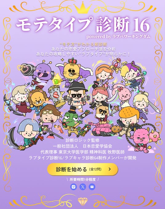 株式会社ラブキャラは、ABEMAオリジナル恋愛リアリティーショー『ラブパワーキングダム2』(2026年2月11日(水)放送開始)との公式コラボレーション企画として、当社は恋愛アプローチに特化した新診断コンテンツ「モテタイプ診断16」を本日公開いたしました。