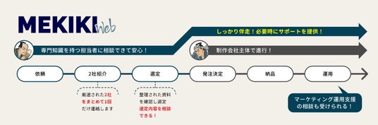 「私たちは制作会社ではありません。しかし、多くの制作会社様と日々連携してクライアントのマーケティングに向き合ってきました。集客をする我々の立場から見ても、Webサイトによって成果が大きく変わります。これまで見てきた多くの失敗事例を、これからの企業の成功の糧に変えたい。MEKIKI Webは、マーケティングのプロとしての誇りをかけ、貴社に最高の結果をもたらす制作パートナーをご紹介します。」
