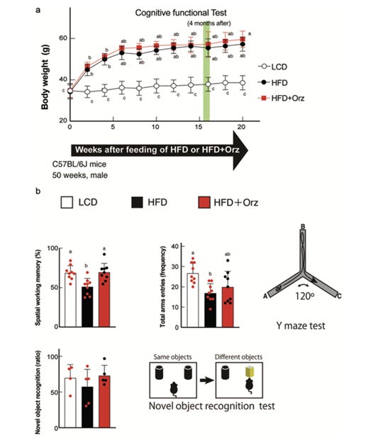 本研究では、高脂肪食によって肥満状態となった高齢マウスモデルを用い、γ-オリザノールを含む食餌を一定期間摂取させた場合の認知機能および脳内変化を評価しました。その結果、以下のような知見が得られました。