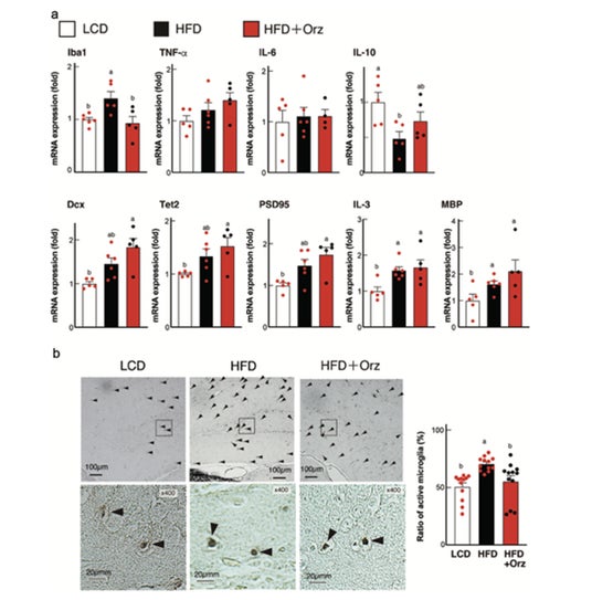 神経新生の指標とされる遺伝子であるDcx (Doublecortin)、Tet2 (Tet methylcytosine dioxygenase 2)などの発現が増加する傾向が確認されました。これらの結果から、γ-オリザノールが脳の炎症状態の変化や神経新生に関わる生理学的メカニズムに関与する可能性が示唆されました。