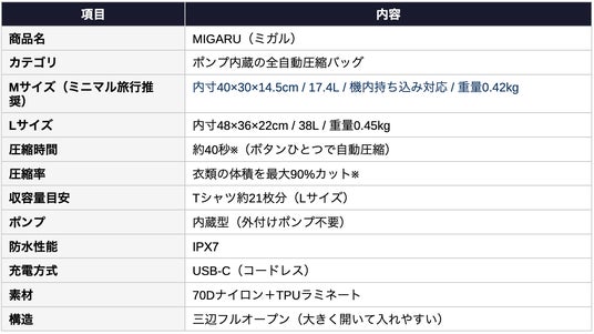 MIGARUは、内蔵ポンプで衣類を約40秒※で最大90%※まで自動圧縮するトラベルバッグ。外付けポンプや掃除機は不要で、ボタンひとつで旅行の荷造りが完了する。Mサイズ(内寸40×30×14.5cm/17.4L)は国内主要航空会社の機内持ち込み基準に対応し、預け荷物なしのミニマル旅行を実現する。