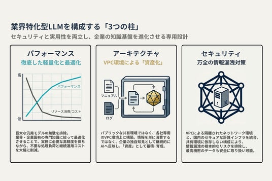 こうした背景から今、求められているのは、安全な環境で運用でき、必要な機能だけを備えた軽量かつ最適化された専用AIです。Neurosphereはこのニーズに応えるべく、企業ごとの知識やノウハウを安全に取り込み、業務成果に直結する「業界特化型LLM」の開発に着手しました。