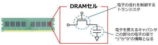 従来、この乖離は高速処理や周辺回路の影響によるものと考えられてきましたが、実験的な検証は行われていませんでした。NTTはこれまで、情報と熱力学の関係に着目した研究(マクスウェルの悪魔(※4)による発電の実証など)に取り組んできましたが、本研究では、電子デバイスにおける情報処理の省エネルギー限界の解明をめざしました。具体的には、高速処理や周辺回路の影響を排除するため、Dynamic Random Access Memory (DRAM)において1ビットを構成する最小単位のメモリ素子であるDRAMセルの回路構造(図3)を対象に、低速で初期化操作を行った場合にランダウア限界に到達するかを検証しました。