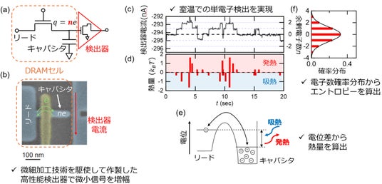 エントロピーは、情報の確率分布から計算される物理量です。DRAMセルの情報を決めるキャパシタの電荷量を単電子単位で測定することで情報を正確に取得できるため、これによりエントロピーを計算することが可能になりました。(図4(f))。