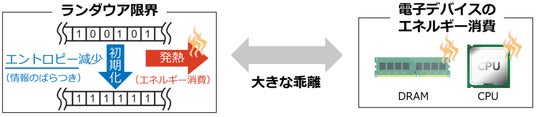 図2:ランダウア限界の解説と、電子デバイスのエネルギー消費との乖離を示す模式図