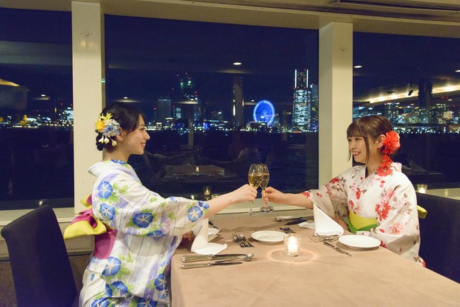 女性の浴衣は約100枚、男性の浴衣はサイズ毎に約10枚から好きな新品浴衣・帯・下駄のセットを選ぶことができ、プロが着付けをします。浴衣に着替えたら赤レンガ倉庫裏にある船着場に移動し、17:00出航の「マリーンルージュ」に乗船、横浜港クルーズとフレンチディナーを楽しめる企画です。浴衣は持ち帰れるので、下船後も浴衣姿で横浜観光をしていただけます。