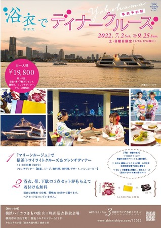 横濱ハイカラきもの館(横浜市中区山下町1番地/運営:株式会社新日屋/代表:山口洋文)は、2022年7月2日(土)から 9月25日(日)の期間、土・日曜限定で横浜を代表する観光船「マリーンルージュ」とコラボレーションして「浴衣でディナークルーズ」企画を開催します。2年ぶり6回目となる今年は、船着場が山下公園から赤レンガ倉庫裏に変更となり、より横浜観光がしやすくなりました。また、男性料金を値下げして男女共通価格となったため男性のご利用がお得です。花火大会にかわる夏の浴衣でのお出かけ先におすすめです。
