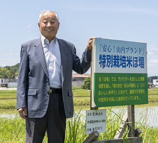 竹粉と牛糞で1年かけてつくる竹堆肥を使った土でつくった自慢のお米。世界最大の米コンクール「第25回米・食味分析鑑定コンクール国際大会」の「都道府県・海外地域代表 お米選手権」部門で金賞を受賞しました。
