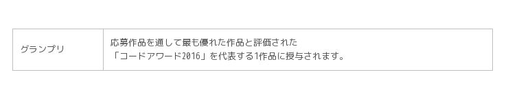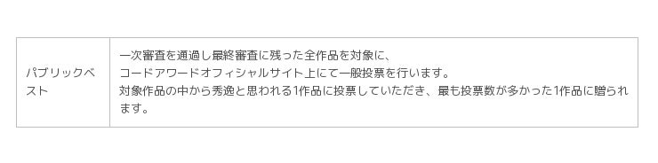 なお、7月27日(水)にD2Cホールにて開催する「コードアワード2016贈賞式」では、受賞作品の贈賞や、一般投票により選ばれた「パブリックベスト賞」の発表を予定しております。