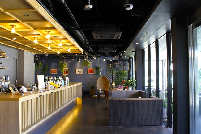 敷地の奥の方に入口があるため、ちょっとした隠れ家的なお店に見えますが、エントランスを入ると、こんな素敵なカフェ&バーがあることに驚かれるのだとか。