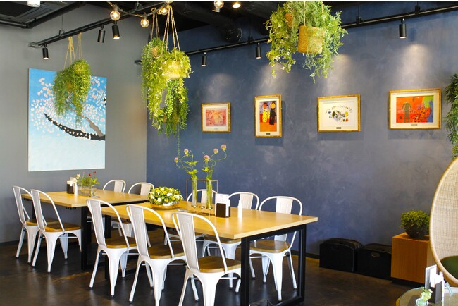 グリーンがいたるところに置かれた、落ち着きある店内。デザイナーズ家具を配したコーナーなどはホテルのラウンジのようです。