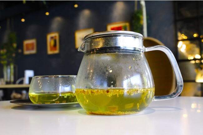 「デパート勤務時は物産展を担当していたので、良いと思ったものをセレクトして店に呼んでくる、という仕事をしてきました。ちょうど薬膳茶や中国茶を仕入れようと思っていたタイミングでfuachaの花茶に出あって品質の高さに驚き、さっそく提供を決めました。いわゆる一般的なばら茶は、香水のように香りが強いものが多い中、これは自然な優しい香りで、身体になじむ感じがしました。すでに当店でもお客様から大変好評いただいておりまして、金木犀が女性のお客様に人気があります。あと、菊花茶もお試しで飲んでいただくと『おいしい!』と、注文される方がほとんどです」