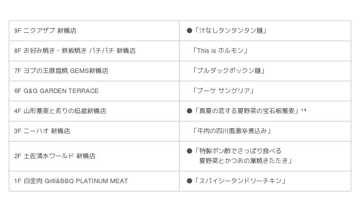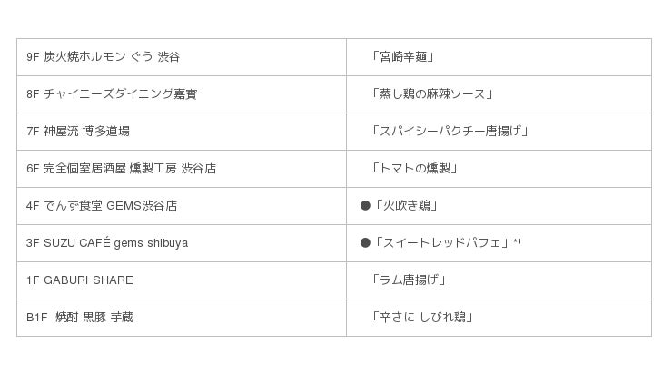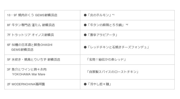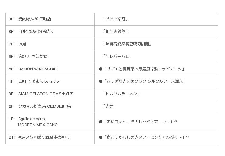 RED RED RED Carnival!と題し「赤」に掛け合わせた「冷たい」 「熱い」 「ヘルシー」「リフレッシュ」 「辛い」「肉」「海鮮」の7種類のジャンルで73品(うち新作オリジナルメニュー42品)を各実施店舗にてご提供します。カーニバルのようにアツく、華やかなGEMS夏のお祭りをご堪能下さい。