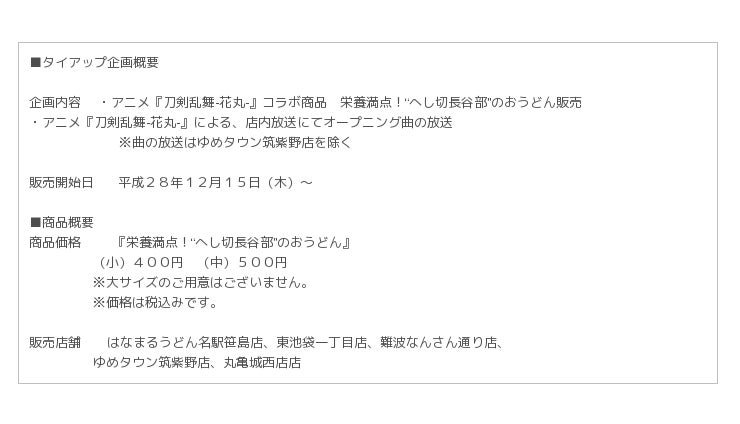 讃岐うどんチェーン「はなまるうどん」を展開する株式会社はなまる(本社:東京都中央区 代表取締役社長:成瀬 哲也、以下はなまる)は、アニメ『刀剣乱舞-花丸-』とコラボレーション商品の販売を店舗限定で行います。