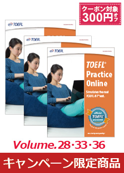世界中のTOEFL iBTテスト受験者が試している公式オンライン模試。今回は「Volume 28・33・36」の3コードセットに限り通常の3コード複数購入よりもお得にしました。まだトライされていないVolumeであればぜひこのセットをご利用ください。また「単品購入」(*)、「Volumeを選びご購入いただく複数購入」(*)は、ご好評をいただいた「円高還元セール」の特別価格で引き続きご提供いたします。