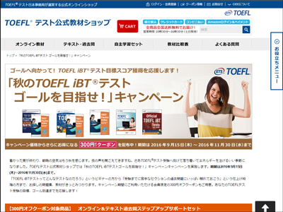 TOEFL(R)テスト公式教材ショップはTOEFL(R)テスト⽇本事務局として活動をしている国際教育交換協議会(CIEE)⽇本代表部が運営するオンラインショップです。2016年9⽉15⽇(木)から開催していました「秋のTOEFL iBT(R)テスト ゴールを目指せ!」キャンペーンも開催期間残りわずか2週間、11⽉30⽇(水)までとなりました。お得なクーポンがご利用できるのもこの期間まで。この機会にぜひお買い求めください。