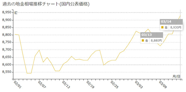 2022年4月に記録した 8,860円/1gを突破し、3月13日 8,880円/1g、更に本日 8,930円/1g と2日連続過去最高値を更新。