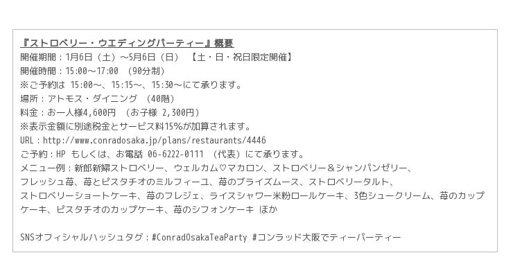 【2017年12月19日】コンラッド大阪(大阪市北区中之島、総支配人カラン・シン)40階「アトモス・ダイニング」では、1月6日(土)から5月6日(日)までの土・日・祝日限定で、デザートブッフェ『ストロベリー・ウエディングパーティー』を開催いたします。料金はお一人様4,600円(お子様2,300円)、午後3時00分より午後5時00分までご提供いたします。