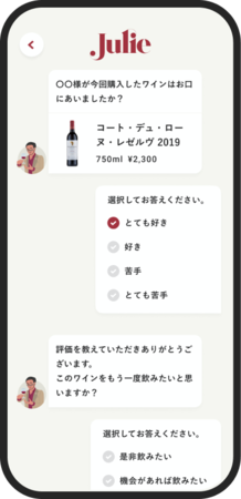 「Julie」は、独自に搭載されたAI機能がユーザーの嗜好を理解し、ひとりひとりにぴったりのワインを提案するECサイトです。初回利用時に簡単な質問に答えることでユーザーの味覚を把握し、数あるワインの中からおすすめのワインを導き出します。また、購入履歴やレビューのデータが蓄積されることで好みがアップデートされ続け、今まで出会うことがなかったワインを紹介してくれることも。多くのユーザーが抱える、数々のワイン選びにまつわる悩みを解決します。