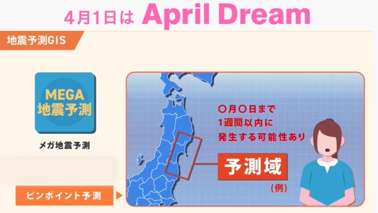 当社は、4月1日を夢を発信する日にしようとするApril Dreamに賛同しています。このプレスリリースは「株式会社地震科学探査機構」の夢です。地震予測サービス「MEGA地震予測」を提供する株式会社地震科学探査機構(本社:東京都港区、代表取締役:橘田 寿宏、以下 JESEA)は、地震予測サービス「MEGA地震予測」で配信している「ピンポイント予測」の精度向上に努め、1週間前に地震が予知できる「高精度地震予知」の実現を10年以内に目指します。日本は世界有数の地震大国とも呼ばれ、世界のマグニチュード6以上の大きな地震の約20%が日本で発生しています。東日本大震災をはじめ、地震災害は日本に甚大な被害をもたらしてきました。地震は自然災害であり、発生を防ぐことはできません。しかし、地震が起きることを前もって知ることができれば、地震に対して備えることで被害を最小限に抑えることができます。JESEAが目指すのは、すべての大きな地震に備えることのできる社会です。